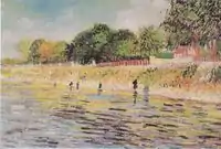 Watercraft rowing, called "le rowing" by the French, was a sport picked up from the English and became popular by the 1880s. Clubs and competitions were established for amateur sportsmen to meet on the Seine. Van Gogh's friend John Russell was an avid participant in local competitions.[27] In the summer of 1887 they often met at Theo's apartment on Rue Lepic where Russell was shown Vincent's paintings of boats, bridges and islands along the Seine, which with Russell's interest in rowing may have been inspiration for his paintings of the Seine at Bougival and Le Pecq.[28]