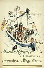 He chose horse racing[i. 3] as a way to enter high society.[16] In June 1900 he self-published his new album Le Turf of caricatures of many prominent Parisian socialites, including Marquess Boni de Castellane, Prince Trubetskoy, Count Clermont-Tonnerre, Baron Alphonse, Gustave de Rothschild, and Polaire.[16] The album's success made him famous overnight.[17] In October 1900 he published the album Paris-Trouville with equal success. Goursat published nine other albums before 1913.[18]