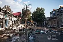 The strike took place just hours after United States Secretary of State Antony Blinken landed in Kyiv to meet with Ukrainian officials.[9] Ukraine's President Volodymyr Zelenskyy condemned the attack, describing it as "utter inhumanity" saying "Russian terrorists have attacked a regular market, shops, and a pharmacy, killing innocent people."[10][11] Ukrainian Prime Minister Denys Shmyhal wrote that "There will be a just retribution for everything."[9]