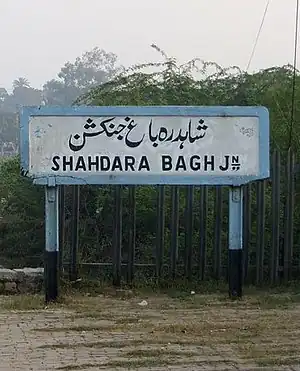 Shahdara Bagh Junction Railway Station (Urdu and Punjabi: شاہدرہ باغ جنکشن ریلوے اسٹیشن) is located in Shahdara Bagh, Lahore District of Punjab province of Pakistan.