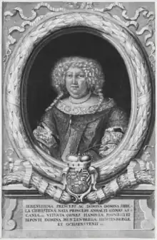 Sibylle Christine of Anhalt-Dessau (11 July 1603 in Dessau – 21 February 1686 in Hanau), was by birth a member of the House of Ascania and princess of Anhalt-Dessau. Through her two marriages she became Countess of Hanau-Münzenberg and Hanau-Lichtenberg.