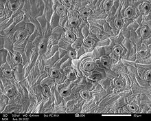 Scanning electron microscope image of S. r. austrofloridense. The cells of the leaf surface (epidermis) have visible grooves. The darker, "mouth-like" openings are stomata.