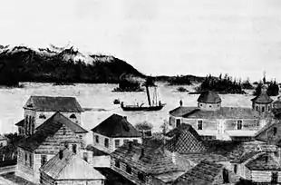 In this mid-19th century watercolor, the tall building to the left of the boat is the original Sitka Lutheran Church. The large domed building facing it is St. Michael's Cathedral.[1]