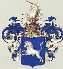 In an azure field, a silver unicorn with scarlet eyes, tongue, horn and hooves galloping to the right. The shield is surmounted by a noble crowned helmet. Helmet: An erect unicorn with scarlet eyes, tongue, horn, and hooves. Insignia: azure with silver. The coat of arms of the Skarzhinskys is included in Part 12 of the General Armorial of the Noble Families of the All-Russian Empire, page 68.[49]