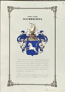 When submitting documents (February 1686) for entering the genus into the Velvet Book, the pedigree of the Skarzhinsky family list was provided and the colonel of the Reitar system, Pyotr Grigorievich Skarzhinsky, submitted (April 1686) to the Ambassadorial Order for translation into Russian two "certified sheets" of Polish ambassadors and nobles about the Skarzhinsky gentry. In the same year, Pyotr Skarzhinsky filed a petition in which he asked to send translations from the "sheets" to the Chamber of genealogical affairs and attach them to the genealogy of the Skarzhinsky family, which was done (August 31, 1686).[34]