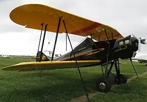 The 'Skyote' is a conventional open-cockpit biplane design, with fixed, tailwheel undercarriage.[6] The wings are slightly swept for center-of-gravity and lateral stability[7] reasons and to improve performance in snap rolls.[7] The equal-span, staggered wings are braced together with conventional struts and wires that form a single bay.[8] Neither the upper nor lower wings have any dihedral,[7][8] and ailerons are fitted to all four wings.[7][8] The fuselage is built from welded steel tubing with wooden stringers and formers to give it shape,[9][10] the wing structure is aluminum,[7][8] and the entire aircraft is covered in fabric.[8]