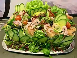 VariationsLiver pâté, shrimp, smoked salmon, ham, various cold cuts, caviar, olives, tomato, cucumber, grapes, lemon slices, cheese