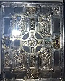 The book was lost sometime in the late 18th century, and almost nothing of its content or style was recorded.[4] The 8th-century dating of the core and its manuscript are based on its dimensions, which would have been larger in earlier centuries.[6] The object was heavily embellished and added to between 1001 and 1025 when bronze, copper and silver plaques were fastened with nails and rivets. Embossed silver plates were added in the 15th century, but are now mostly lost.[7]