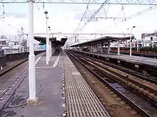 The station consists of two elevated island platforms serving four tracks and a single unnumbered side platform outside the inbound siding track. Normally, only the island platform is used, and the single platform is a 'temporary platform' for getting off, which was mainly used when the Sonoda horse race is held.