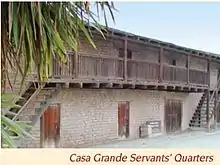 La Casa Grande was the Vallejo family's first home. At the time one of the most imposing and well-furnished private residences in California. It stood with its wide second-story balcony overlooking the town's plaza. Although the house was not finished until 1840, there is reason to believe that a portion of it was completed in time for Vallejo's second daughter to be born there on January 3, 1837. In all, eleven Vallejo children were born in the house. Over the years La Casa Grande became the center of social and diplomatic life north of San Francisco Bay. About 1843, Mariano Vallejo added a three-story adobe tower to the southwestern corner of the house. From this vantage point it was possible to look out over several miles of the Sonoma Valley. An adobe wall connected the tower and Salvadore Vallejo's house to the west.[11] Built in an L-shape, the rear section contained a kitchen and sleeping quarters for Vallejo's staff of Native Indian servants.[12]