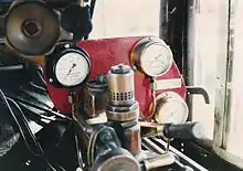 Other visible differences are larger mechanical lubricators and external drive from the valve spindle, a vacuum ejector exhaust muffler just in front of the safety valves, pipes conveying exhaust and ejector steam to the ashpan for mixing with the primary air, the secondary air inlets in the firebox sides with spark arresting plates outside them, and the snifting and bypass valves which were removed and blanked off since the modified locomotive drifted in mid-gear with steam supplied from the drifting valve.[1]