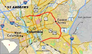 SC 16 begins at an intersection with SC 48, just south of the University of South Carolina. Going in a counterclockwise direction, it goes east to U.S. Routes 76 and 378 (US 76/US 378) at Devine Street, then north intersecting SC 12 (Forest Drive) within the small portion of Forest Acres through which SC 16 travels, and US 1 (Two Notch Road). Heading now west, it intersects SC 555 (Farrow Road) before splitting into one-way streets: northbound along Marshall Street and southbound along Sunset Drive and Academy Street. SC 16 recombines onto Sunset Drive at the SC 277 (Northeastern Freeway) northbound on-ramps, flanked by the Palmetto Health Richland. Continuing east, SC 16 ends at US 176 (River Drive), approximately one mile (1.6 km) east of the Broad River.