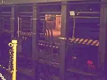 After 1959, all 1 trains became local, while 3 trains stopped serving the station, instead making express stops on the Broadway–Seventh Avenue Line and using the Clark Street Tunnel south of Chambers Street.[119] Because of the sharp curve of the inner loop, only the center doors of a train opened there; however, the "R"-type cars could not open only their middle doors. As a result, Lexington Avenue trains were rerouted to the outer loop.[120] The Bowling Green–South Ferry shuttle, which ran weekdays and at first also late nights, continued to use the inner loop, running to the west platform at Bowling Green.[121] Specially modified R12 cars were used starting in the late 1960s until the service ended. These cars had two different door controls; the first opened the outer two sets of doors while the second opened the center set of doors only.[120][122] The inner loop closed permanently on February 13, 1977,[121] but the inner loop track is still used by 5 trains that terminate at Bowling Green during off-peak hours.[123]