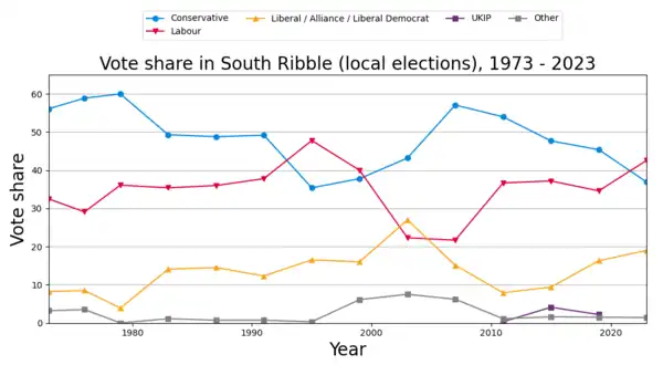 South Ribble Borough Council elections are held every four years. South Ribble Borough Council is the local authority for the non-metropolitan district of South Ribble in Lancashire, England. Since the last boundary changes in 2015, 50 councillors have been elected from 23 wards.[1] The next borough council elections are due to take place in 2027 as part of the wider 2027 United Kingdom local elections.[2]