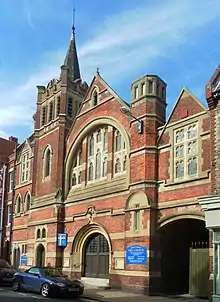 South Street Free Church was designed in a "heavy" Arts and Crafts style with elements of Gothic Revival architecture,[11] described as "Free Gothic"[12] rather than aligned to any particular historic era. The building is of red brick with stone dressings and horizontal bands.[11][12] The windows are set in stone surrounds with mullions and transoms.[11] The "quirky",[2] "busy"[11] façade has a "characterful asymmetry":[2] it consists of five bays of unequal width and height. From left (west) to right, there is a narrow bay with a "domestic character", topped by a small gable and with a pair of small arched windows; a short tower with a louvres and a recessed spire; the main entrance bay, with a wide gable and windows set in a large semicircular arched recess; a short turret with a polygonal stone upper stage; and a low gabled section with similar fenestration to the westernmost bay.[2][11] In the narrow street, with tall buildings on both sides of the church, the tower serves as a landmark without dominating the church or its surroundings.[2]
