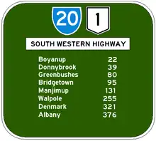 South Western Highway is a highway in the South West region of Western Australia connecting Perth's southeast with Walpole. It is a part of the Highway 1 network for most of its length.[1] It is about 406 kilometres (252 mi) long.