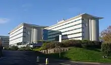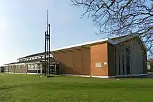 St Mary's Church is the Anglican parish church of Southgate. The churches in the Broadfield, Furnace Green and Tilgate neighbourhoods are linked to it as daughter churches.[63] Architects Henry Braddock and D.F. Martin-Smith designed it in 1958. The concrete and glass structure has a small flèche on top of a bell tower, and has an adjoining hall which can be opened out to increase the capacity of the church.[35] It is on Wakehurst Drive opposite the main shopping parade. The Church of Jesus Christ of Latter-day Saints has a meetinghouse on Horsham Road; it was designed by the chief architect of the town, Sir Thomas Bennett, and built in 1964 on land provided by Crawley Development Corporation.[64] ChristChurch (formerly Gateway Church International) on Brewer Road is a non-denominational church associated with the New Covenant Ministries International movement; its barnlike building has a semicircular roof.
