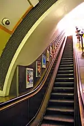 The original escalators were replaced in the late 1980s with the then standard London Transport design. The balustrade of the escalators was manufactured from bronze, rather than aluminium to maintain the 1930s period appearance of the station and to satisfy the requirements of English Heritage.
