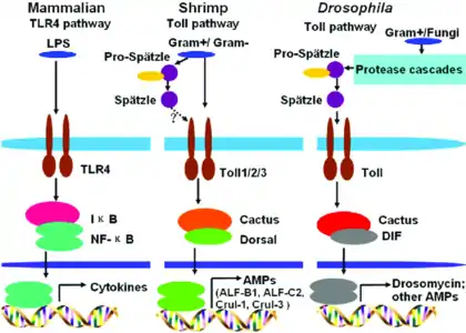 - ↑ Morisato D, Anderson KV (February 1994). "The spätzle gene encodes a component of the extracellular signaling pathway establishing the dorsal-ventral pattern of the Drosophila embryo". Cell. 76 (4): 677–88. doi:10.1016/0092-8674(94)90507-x. PMID 8124709. S2CID 26328826.