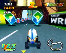 The game involves racing around a variety of tracks while using several weapons, including items that make the racer's speed increase, missiles, and slime.