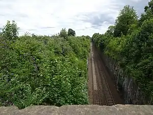 The station was located where the Warmsworth to Sprotbrough road crosses the line over the deep limestone cutting and was approached by a covered flight of 66 steps to the Sheffield-bound platform.[1] The station had two flanking platforms and a small wooden shelter which served as both ticket office and waiting room. Following the closure of the station on 1 January 1875, this structure served as a platelayers hut until the mid-1950s.
