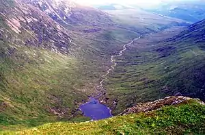 Sròn a’ Choire Ghairbh reaches a height of 937 metres (3074 feet) and is classified as both a Munro and a Marilyn. It is highest of the Loch Lochy hills and is invariably climbed along with the neighbouring Munro of Meall na Teanga to which it is joined by the distinctive col of Càm Bhealach. Both these hills which are often referred to as the Loch Lochy Munros are well seen from the A82 road on the opposite side of the loch, showing steep slopes which are forested below the 300 metre contour. There are also extensive conifer plantings on the lower northern (Glen Garry) side of the mountain, this is gradually being restored to native species.[2] The hill's name translates from the Gaelic as The Nose of the Rough Corrie,[3] referring to the summit's location on the edge of the craggy Coire Glas, which stands to the east.