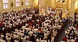 The New York Times reported that President James Buchanan and several Cabinet members were present for the dedication of the church on October 16, 1859.[4] Jesuit Father Benedict Sestini, a Mathematics teacher at Georgetown University, served as the church's architect. The painting above the main altar, showing Aloysius Gonzaga receiving his first Holy Communion from the hands of Cardinal (St.) Charles Borromeo, was the work of the noted Constantino Brumidi, who is famous for painting the frescoes in the rotunda of the United States Capitol.