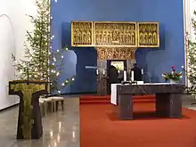 St. Bernward's Church houses several sightworthy pieces of art. The Gothic retable showing various saints and the Coronation of the Virgin dates from 1430.[5] It originally stood in Trinitatishospital, a hospital which was founded in 1230 and destroyed in 1945. There is also a remarkable statue representing Saint Bernward holding a Bernward Cross in his hand. The golden Bernward Cross which was made about 1130 is one of the most famous items in the museum of the Cathedral of Hildesheim.
