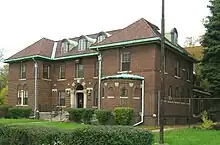 The church is the most visually catching structure. It is built in the form of a Latin cross, of mixed red and brown tapestry brick. The main façade has a gable form with a Romanesque arcaded portico containing the entrance and three tall windows above.[2] A wheel window is placed in the pediment. Single-story wings with entrance doors flank the front, and a tower is located on the right side of the building.[2]