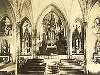 In 1892 the present rectory was built as a Franciscan monastery with 30 rooms plus a spacious attic. The previous rectory was located directly to the east of the church and needed to be moved to make way for an expansion of the church building. The parish then numbered about 100 families, fairly evenly divided between farmers, railroad people, and other business people. In 1894 the church was expanded, adding an apse and two transepts containing large stained-glass windows made by George A. Misch and Brothers of Chicago. The south window depicts the three patrons of the Franciscan order: St. Clare, St. Louis IX, King of France, and St. Elizabeth.[3] The north window shows the Holy Family of Jesus, Mary, and Joseph. The four stained-glass windows in the apse depict St. Francis receiving the stigmata, the Annunciation, the child Jesus appearing to St. Anthony, and St. Margaret Mary Alacoque receiving the devotion to the Sacred Heart. Much of the statuary dates back to the late 19th century and was manufactured in Munich, Germany.[4]:55