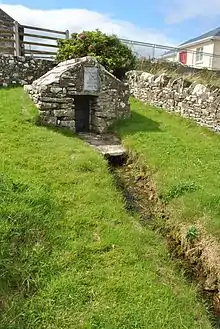 Curative powers were also ascribed to earth coming from the saint's grave. The prerogative of administering it to visitors belonged to the Machan (Maughan) or Loughney family, presumably because the family was known to descend from the erenachs (wardens) of the church.[1] A flagstone at the saint's grave known as Leac Cuimín (The stone of Cuimín) is thought to have been used as a 'cursing stone' under similar guidance: members of the Machan (Maughan) or Loughney [6] family could be asked to perform a ceremony to call down maledictions on people who had caused harm to others.[1][7] The practice came to an end in the first half of the 19th century, when a dean by the name of Lyon had it removed "for certain weighty reasons" and built into the wall of the cathedral at Ballina, County Mayo.[7]