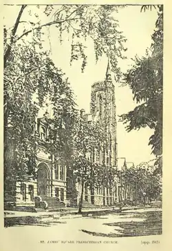 Located on Gerrard Street, just east of Yonge, on the present site of Toronto Metropolitan University's St. James Square Campus, this was the third building of the Second United Presbyterian Church of Toronto. It was built in 1879, replacing a much smaller building at southeast corner of Gould and Victoria Streets (now Ryerson Community Park) that had been built by architect William Hay in 1855–1856.