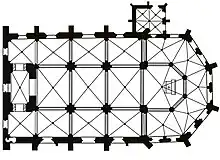 St. Marien is a three-aisled hall church without a transept. The main aisle is three bays long. The bays in the central nave are slightly rectangular. Both side aisles are four bays deep, these having a slight oblong shape. The central nave is separated from the side aisles by archways consisting of large compound piers. The extension of the side aisles by one bay each enables the inclusion of the western tower in the interior architecture. On the eastern side, the nearly-quadratic hall is appended by the polygon-shaped basilican chancel. Attached to the chancel on the north side is the quadratic sacristy, covering four bays. This has four arches, all buttressed by one central compound pier. The Gothic hall is overlaid by ribbed vaults. The nave is 20.56 metres long in total, which represents only a slight difference from the length and width measurements (roughly 25.5 and 24.5 metres respectively). This gives the nave an almost-cubical shape. The central nave is only slightly wider than the side aisles. This results in merely a weak accentuation of the longitudinal axis of the church. The bays of the side aisles counteract this slight longitudinal alignment by opening up their broadsides to the central nave, thus emphasising the lateral alignment. This gives the impression of undirected space. St. Marien is thus characterised by the overall appearance of its nave.