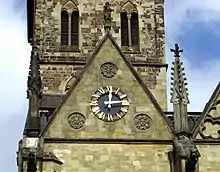 There is a set of five bells in the tower (gis° (Hosianna) –h° (Gloria) –dis' (Amen) –fis' (Kyrieleis) –gis' (Halleluja)), which were recast in 1959 by the Rincker bell and art foundry.[4][5]
