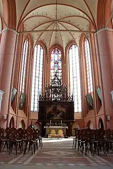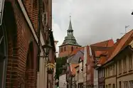 St. Michaelis was built as an abbey church of the former monastery of Benedictines.[1][2] The present church followed three former buildings. Its corner stone was laid on 14 July 1376 in the presence of Bishop Heinrich von Verden, who was bishop from 1367 to 1381. A lower church was consecrated in 1379.[1] The upper church was finished in 1412, the steeple in 1434. The building was erected as a hall church in brick Gothic style. The parish became Lutheran during the Reformation. The monastery became in 1532 a rare community of Protestant men who practised celibacy and common housing.[1] The roof of the steeple was damaged in a storm in 1746, and a new top was erected between 1761 and 1767.[1] At the end of the 18th century, a remodeling of the interior was performed by architect Wilhelm Meissner, during which the medieval furnishings were lost.[1]