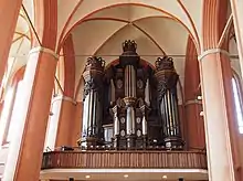The organ dates back to an instrument built in 1708 by Matthias Dropa, a pupil of Arp Schnitger.[1] It was refurbished several times. In 1871, the organ builder Philip Furtwängler & Söhne replaced most of Dropa's pipes. In 1931, Furtwängler & Hammer built a new organ in the case by Dropa. In 1999, the organ was restored, retaining historic parts from 1708 and 1931.[4] St. Michaelis is a venue for sacred music in services and concerts,[2] including events of the Schleswig-Holstein Musik Festival.[6]