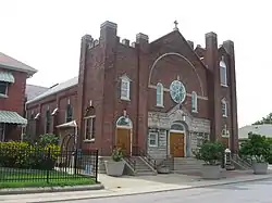 St. Philip Neri Parish Historic District is a historic Roman Catholic church complex and national historic district located at Indianapolis, Indiana. The district encompasses five contributing buildings: the church, rectory, former convent and school, school, and boiler house / garage. The church was built in 1909, and is a Romanesque Revival brick church with limestone trim. It features two- and three-story crenellated corner towers, a rose window with flanking round arched windows, and Doric order columns flanking the main entrance.[2]