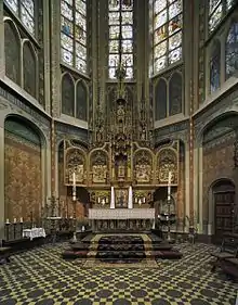 The Willibrord's Church is constructed between 1875 and 1877 after the design of architect Alfred Tepe in gothic revival style. It is one of the most well kept remaining examples of the Utrecht Styl of the gothic revival. The sober exterior of the church is a great contrast with the elaborate and colourful interior. Many artists from the St. Bernulphus Guild worked together to decorate the church. Almost every wall of the church is painted. These colourful paintings are part of the various other elements of the church, including the wood carvings and stained glass windows depicting the life of St. Willibrord. The tabernacle doors are painted by Jacob Ydema (1939). In 2005 a large-scale restoration was completed, helping to maintain the unique and wonderfully colourful interior. The most important part of the church, the choir, is the most extensively decorated part of the church. Central to this is the symbolism of the Holy Sacrament. Because the church is surrounded by houses, the architect chose to build an extra high, yet short building with high windows. The church was dedicated in 1877 by monsignor Schaepman, but the interior wasn't completed until 1891.