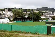 The old grandstand was demolished at the turn of the twenty-first century and replaced by a concrete and metal structure which has a seating capacity of approximately 200.[6] The only other cover at the ground is provided by a breezeblock and timber lean-to behind the near goal. Directly next to that is the large clubhouse, built in 1972, which leads out onto the car park. Blaise Park was the first sports ground in Cornwall to install floodlights in the late 1950s. They were paid for through a scheme of £1 shares and erected by voluntary labour.[6] They were replaced in November 1989 and inaugurated with a friendly match against Football League club Plymouth Argyle. The stadium is joined to Station Road, which in turn feeds onto the A390, one of the major roads in the county. The nearest train station is Par, approximately two miles away, which provides direct transport to Truro, Plymouth, and London.