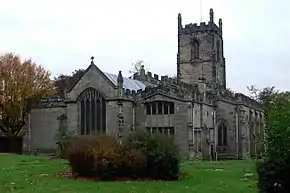 St Helen's Church has a maximum length of 41.70 metres (136.8 ft)[14] and is aligned at 25° north of east.[15] The majority of English churches have an alignment within a few degrees of east, so this is an exceptionally large deviation from the norm.[16][17] The sandstone church has a large, mainly 15th-century west tower supported by corner buttresses and topped with battlements and pinnacles. The tower has a four-light window and west doorway, and contains a spiral stairway to the bell and clock chambers and the roof. The chancel is adjoined by the former north chapel (now the vestry) on one side and the Hastings Chapel, set transept-wise on the other;[4] it has three sedilia and a piscina on its northern wall.[14] The nave is significantly wider than it is long,[4] and has four bays with medieval inner north and south aisles and 19th-century outer aisles. The Hastings Chapel, chancel and clerestory are embattled, and the former north chapel is English Perpendicular, with a window of the same style.[14][18] The piers in the nave were remodelled in the 15th century, and have incised panels, as do some of the arches. This feature is of an unusual style and is also seen at Sherborne Abbey in Dorset and at St Peter and St Paul, Syston, Leicestershire.[14][18]