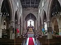 Around 1670, the church was refurbished, a gallery was built at the western end of the nave, and the carved reredos and a large wooden Royal coat of arms, now at the west end of the nave, were acquired at the same time.[10] An inspection report at the end of the 18th century commented on the dirty transept walls, and the need to install the equivalent of a cattle grid to keep pigs out of the churchyard. Rich crimson hangings in the church had earlier attracted the attention of a thief.[11] The increasing congregation led to the replacement of the pews and the construction of galleries down both sides of the building in 1829,[10] but a more extensive rebuilding was undertaken in 1878–80, by James Piers St Aubyn. The galleries were removed and the two outer aisles were added during this period, a chapel was converted to a vestry and improvements were made to the Hastings Chapel. The cost of these works has been estimated as between £16,000 and more than £18,000[6][10] (equivalent to £1,906,300 in 2021).[12] Later developments included the expenditure of £13,000 (equivalent to £239,900 in 2021)[12] between 1963 and 1968 to combat deathwatch beetles found during rewiring, improvements to the heating system, and a rededication in 1974, the quincentenary of the church.[10]
