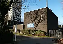The church building was destroyed on 7 September 1940, the first day of the London Blitz, leaving only the old Infants School Hall.[3] The church used the school hall for worship until the consecration of a replacement on 28 October 1968 by John Tiarks, Bishop of Chelmsford - it had been built to a design by Laurence King and Partners.[4][5] In 1974 St Mark's and St Barnabas' Church, West Silvertown (another former mission church of St Mark's) were declared redundant and their parishes merged with that of St John's (St Barnabas' had been administered by the vicar of St John's since 1945) - this formed the still-existent parish of North Woolwich with Silvertown, which is more or less co-terminous with the Royal Docks ward of Newham.[6][7]