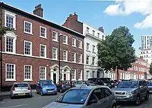 At the Deansgate entrance to St John Street is a Grade II listed K6 telephone box. Dating from 1935, it follows the design of Sir George Gilbert Scott, introduced to celebrate the Silver Jubilee of King George V.[10] The start of the street was the subject of reconstruction and rebuilding in the 20th century, but its remaining length dates from the late Georgian and Regency periods. Built in red/brown brick, and mainly of three storeys, the buildings are all listed at Grade II. The run of houses begins with Nos. 8 and 8A,[11] and continues with No.10, [12] both on the right-hand side of the street; Nos. 11–17,[13] No.19[14] and Nos. 21–25,[15] all on the left-hand side; and Nos. 12–16,[16] Nos. 18 and 20,[17] No.22,[18] No.24,[19] Nos. 24A and 26,[20] and No.28 on the right-hand side.[21]