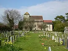 The nave formerly had a pair of porticus-style side chapels, but little trace of these remains—although blocked windows and fragments of archways and gabled roofs have been visible since 1918, when they were excavated.[3][11] The nave's dimensions are 43 by 22.5 feet (13.1 m × 6.9 m), and the walls are about 2.5 feet (0.76 m) thick.[10] The Norman doorway, reset on the north side in its 15th-century porch, have jambs with five stones of irregular length and a five-stone arch. The belfry, at the west end of the nave, sits on top of the roof with no structural link to the inside of the building. It has a shallow pyramid-shaped roof.[10]