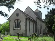The entrance porch on the north wall was erected in the 15th century,[10] but the heavy oak door dates from the Norman era.[5][11] The entrance was originally on the south side; suggested reasons for its move include avoiding the prevailing wind, which blows off the hills straight into the south wall, or a change in the location of the nearby road in medieval times.[5] The squat wooden belfry at the west end of the nave is also 15th-century,[10] as are two of the three bells.[3] The path leading to the porch is unusually made of "ripplestone"—Horsham sandstone taken from a nearby riverbed.[5][11]