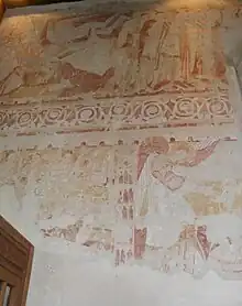 The main subject of the murals is the Day of Judgment, making them an early example of the "Doom" paintings seen in medieval churches across England.[5][15] Pevsner noticed that the figures had characteristic features: "extremely long and lean, with heavy ... garments, exceedingly small heads ... [and] strange headgear".[17] Centrally placed above the chancel arch is an image of Christ in Majesty in a mandorla held by angels and with apostles on each side. Flanking this are Christ giving the Keys of Heaven to Saint Peter (to the left) and a book to Saint Paul.[26] On the north wall of the nave, a procession (led by bishops) approaches the Heavenly Jerusalem, watched by angels and saints, and the defeat of the Antichrist.[18][26] Scenes on the south side include angels, one of the Four Horsemen of the Apocalypse, worshipping saints[3][26] and another procession, this time of the damned: in this dramatic composition, "a spike-heeled devil riding a large beast separates the doomed from the blessed".[18] An angel is also depicted at each corner of the nave: this is another reference to the Day of Judgment, when, according to the Gospel of Mark, "shall He send His angels, and shall gather together His elect from the four winds, from the uttermost part of the Earth to the uttermost part of Heaven" (Mark 13:27).[27] The paintings are heavy with symbolism,[27] and "give a full interpretation of the Last Judgment":[1] in medieval times such paintings were the most important way of conveying information and narratives to worshippers, many of whom could not read.[28]