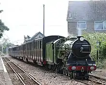 Romney, Hythe & Dymchurch Railway No. 1 "Green Goddess" storms through St. Marys station non-stop with the 2.15pm departure from Dungeness