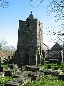 The tower has external buttresses and the door on the west side is set in a pointed arch frame with a hood mould.[3] The buttresses and door were added to the tower after it was built; the 1937 Royal Commission survey described them as "modern".[10] There are two stages (levels) to the tower; the tall upper stage is slightly narrower than the base, which measures 8 feet 6 inches by 8 feet 9 inches (26 by 2.7 m). The tower has simple rectangular openings in the north, east and south walls.[3][10] There is a 17th-century bell in the west wall of the tower in a plain arch opening; the top of the wall is crenellated.[3][8] Behind the parapet at the top of the tower, there is a short spire in the shape of a pyramid, made from wood and covered in slates.[3][10]