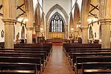The strongly individual building is of stock brick with Bath stone dressings and slate roofs. The tall nave of five bays has low, pent aisles and alternate octagonal and compound piers. The saddleback crossing tower with its very long bell openings is the most striking feature of the building creating inside a tall chancel arch with half-arches at east end of the aisles. The window tracery is a freely-adapted late Decorated type.[7]