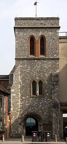 The body of the church was taken down in the late 1950s. The only remains are the 15th-century tower, built of flint and rubble and incorporating a Norman arch, which is Grade II listed. The tower also displays a sundial and the arms of King George III.[3]